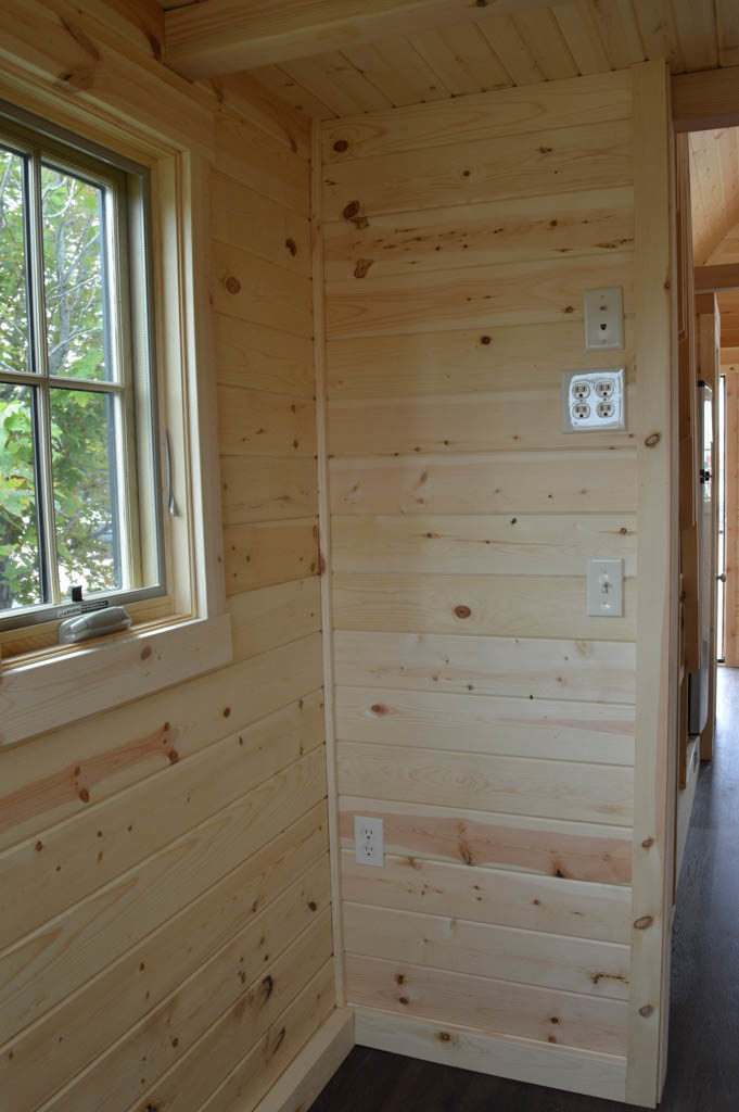 Heating is provided by a propane fireplace stove located below the ladder to the porch-side loft.