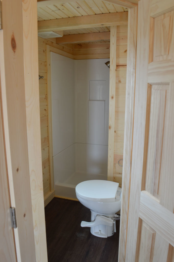 Ariana's model is set up for short-term off-grid use: water tank (rainwater collection possible), stove/oven and refrigerator can run on either electricity or propane, propane fireplace, composting toilet. Gray water (dishes/shower/washing machine) can be held in a small tank and disposed of at a campsite hookup or — if biodegradable products are used (the only kind kept on board) — released in nature. A washer/dryer combo is located under the stairs to the axle-side loft. A solar-panel and battery combination provides off-grid electricity.
