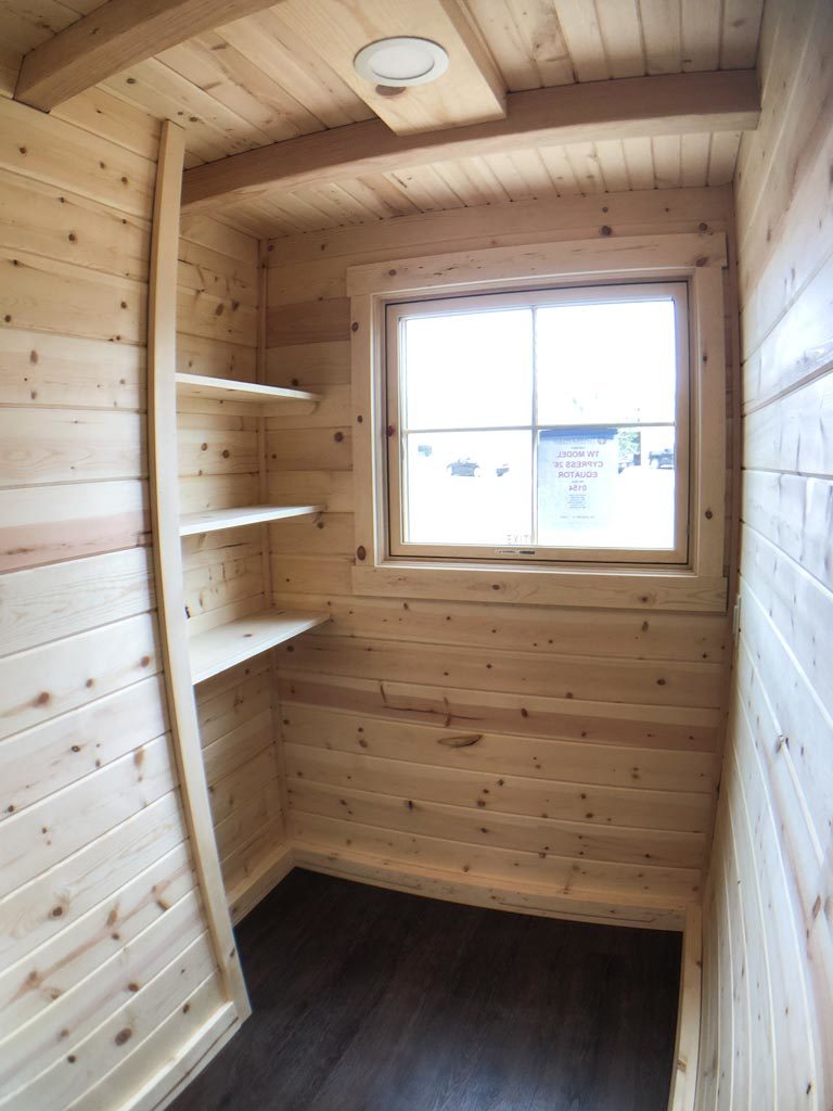 The Sanctum is just over 1 m (~3 ft 3 in) wide and approximately 2.30 m (~7 ft 7 in) long — slightly wider at the built-in shelf next to the axle-side window. The small room has two windows: one facing the axle side, one facing the side of the house.
