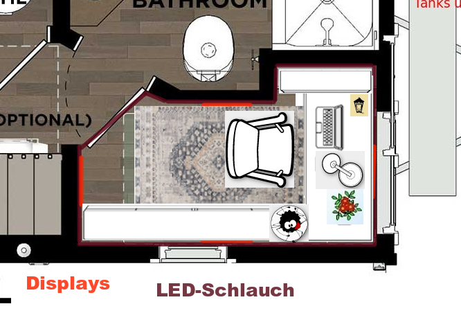 Accessible via stairs, with an additional landing platform above the broom closet — so access goes around a corner. In front of the axle-side window lies a colourful futon, half-rolled up to serve as a sofa — the rolled portion acting as a backrest. The sofa is decorated with a pillow and two throw blankets.