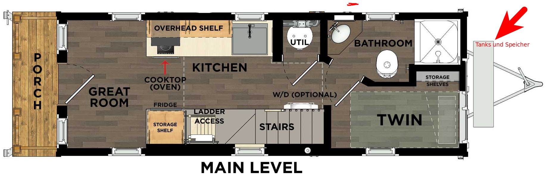 On the side of the refrigerator: a ladder leading up to the porch-side loft (Ariana's sleeping area). Across from the ladder: stairs leading up to the axle-side loft (the 'living room'). Under the stairs: shelves holding towels, laundry detergent etc., as well as the washer/dryer combo — that makes the whole house wobble during the spin cycle.