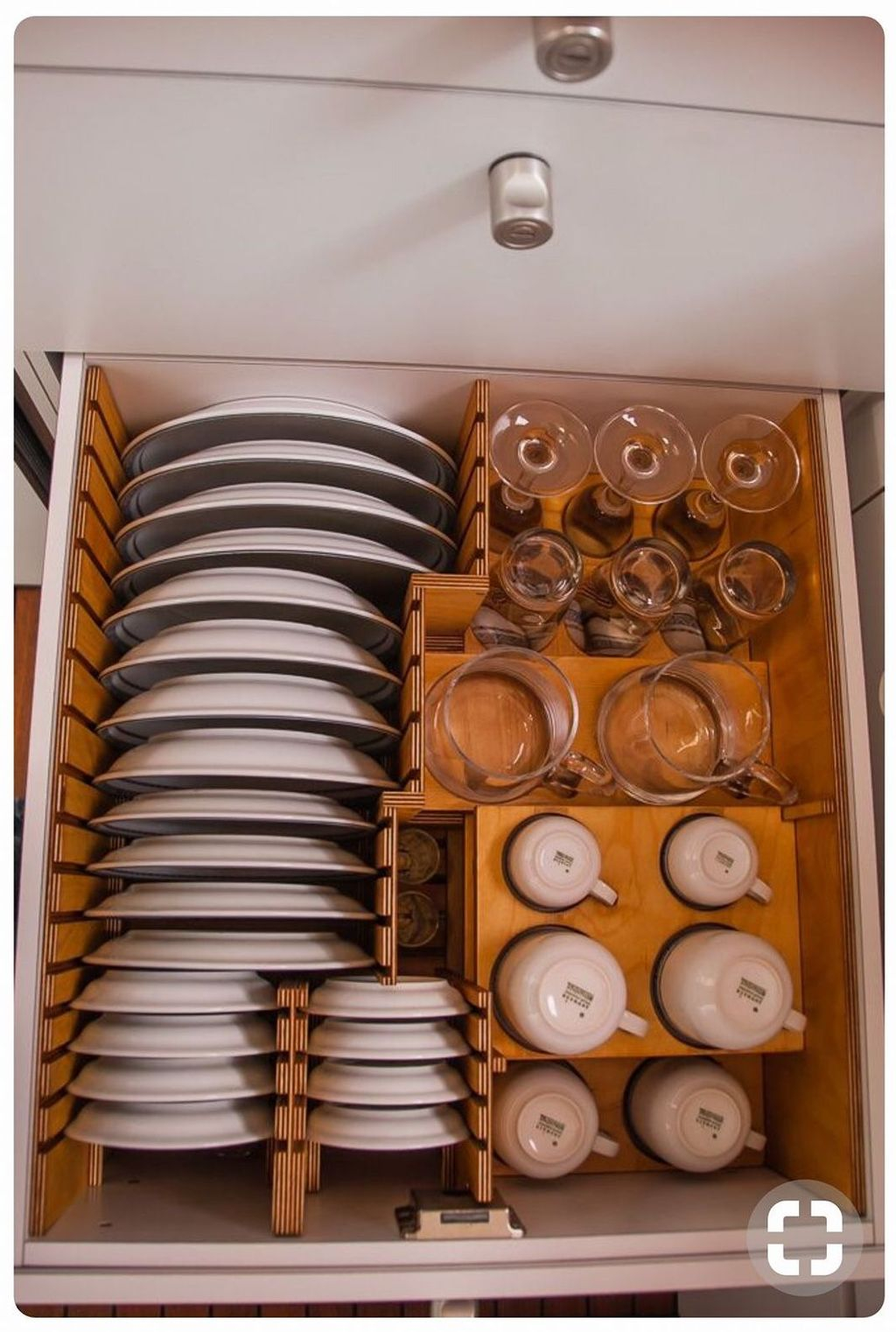 Directly in front of the railing on the interior side of the loft: a square-compartment shelf, flush with the top of the railing, where Ariana's everyday clothing is stored in baskets — also providing additional visual privacy. When the house is stationary, two Pac-Man decorative lamps sit on top of the shelf.