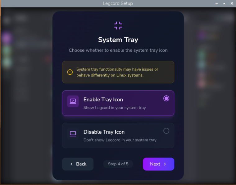 When starting Legcord for the first time, you'll be asked to set some basic options.